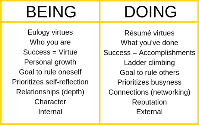 The problem with our DOING/hustle porn/hyperactivity mindset is that true self-worth and success come from internal virtues rather than external activity.