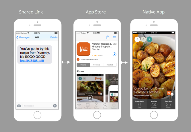 Now that we understand the problems, let’s take a look at the current solutions. The word “app linking” may not sound familiar to you, but every time you tap on a YouTube link in another app and the YouTube app opens up to play the video, you’re experiencing it. Google, Apple, and Facebook have all implemented variations of this technology. App linking brings you to the app that best presents the content you want. Great.