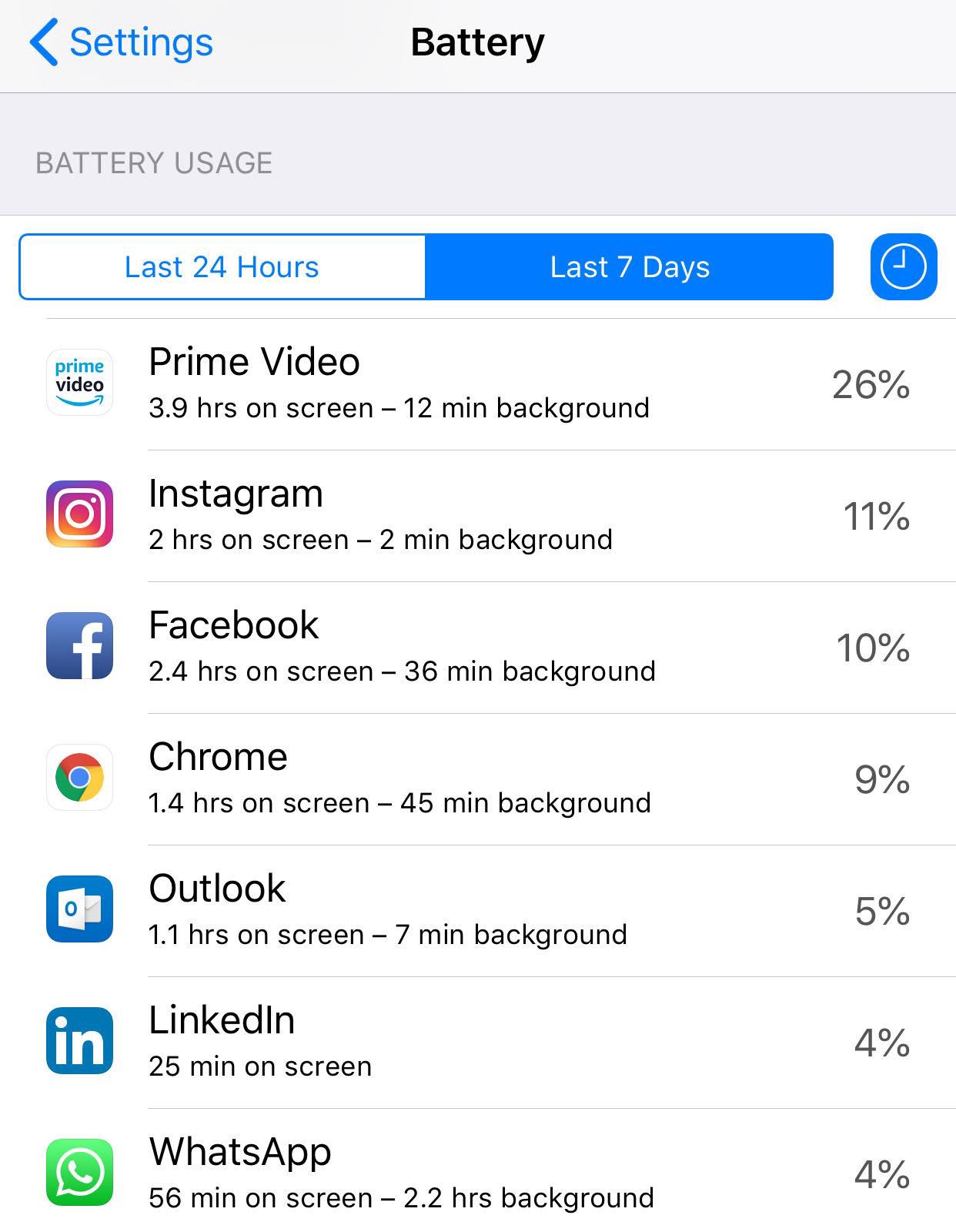 If you are an iPhone user, you don’t even need to look at these stats, you can see the time spent using various apps by looking at battery usage. For instance —