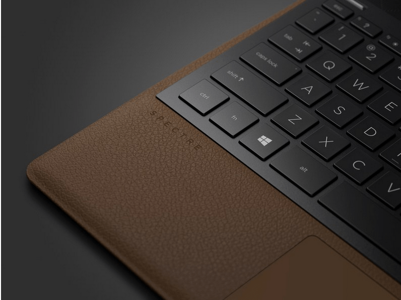 Its keyboard is plushy, noisy, and backlit. Like previous Spectre laptops, it has front-facing Bang and Olufsen speakers. It has a fanless design, relying instead on a metal heat spreader to push heat out from laptop’s hinge area and into the empty space that exists between the hinge and the curve of the leather.