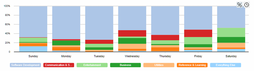 There are lots of tools out there to track where you’re spending your time. I use one called RescueTime which is not bad. It records open application windows and URLs and I can group these into activities. Here I can see where I’m spending my time each day:
