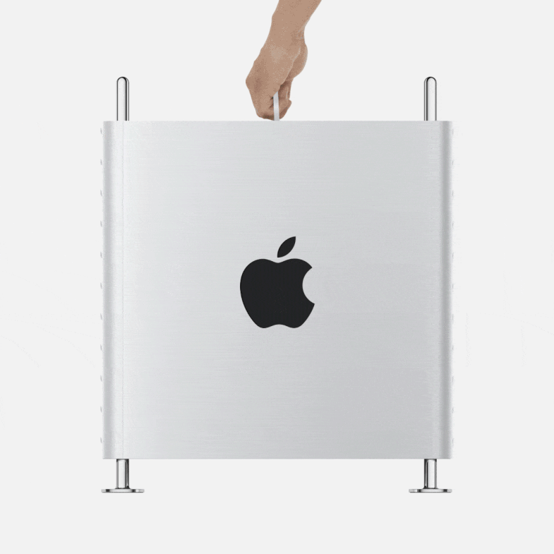 Like the latest debut from Lamborghini or McLaren, this Mac Pro has an immediate visual impact, looking at once familiar and enticingly novel and different. It carries on a family lineage — from the original Mac Pro, pretending the 2013 “trash can” never happened — expressed in the pair of steel handles and the latticed front and rear. Apple’s famously meticulous attention to detail is expressed in the curves and forms of this Mac Pro chassis, and it’s the little touches that make the design intriguing and memorable. There are no corners to the aluminum sheath, for instance, which slides on and off with apparent ease.