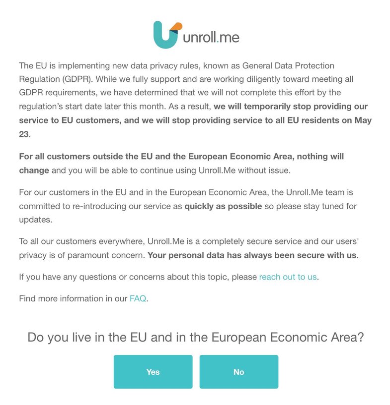 It will be interesting to see the impact of GDPR on data sharing practices. In theory, the GDPR only applies to EU citizens’ data; the global Internet means that nearly every online service is affected. Some companies have chosen to make their sites and services no longer available to those in Europe (including a number of US regional newspapers, clothing company Modcloth, Instapaper and Unrollme: