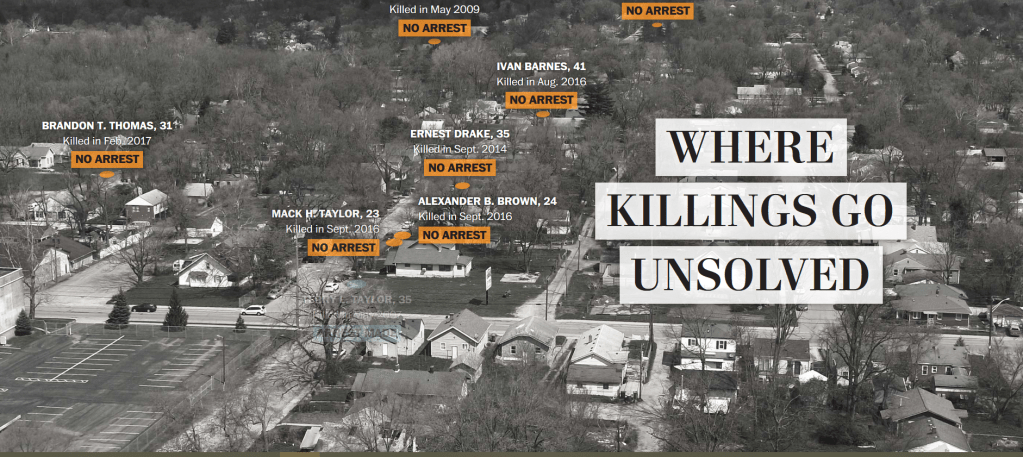 Among them is Crown Hill, a neighborhood of primarily poor black residents living in modest single-family homes. In the past decade, there have been 40 killings but only 12 arrests.