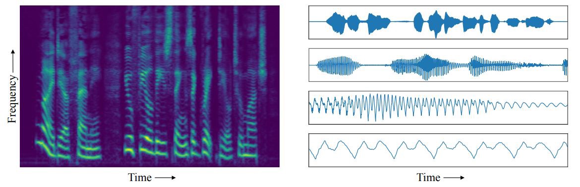 These waveforms show specific patterns at a number of different scales. During a few seconds of speech, for example, the waveform reflects the characteristic patterns associated with sequences of words. But at the scale of microseconds, the waveform shows characteristics associated with the pitch and timbre of the voice. And at other scales, the waveform reflects the speaker’s intonation, the phoneme structure, and so on.