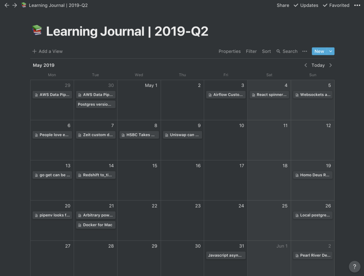 Every entry in that calendar is a separate note within Notion, but it’s organized such that it’s easy for me to: 1) remember when I learned this (a form of situated learning), and 2) keep track of progress in learning new things (for my OKRs).