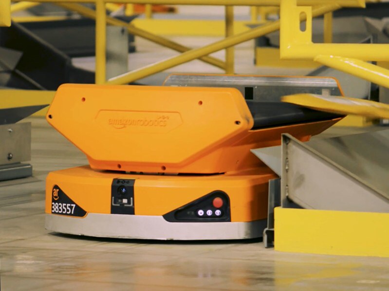 Ready for more complexity? Amazon had to tweak the built space itself to keep the machines happy. Humans doing things the old way on the other side of the building, for instance, enjoy basking in the photons that pour through skylights. Above the robots’ field, though, the skylights are covered, because the glare might throw off the machines’ sensors. To navigate, they’re using a camera on their bellies that reads QR codes on the ground. Even the air-conditioning units hanging from the roof are modified. On the human side, they blow air straight downward, but above the robots they blow out to the side, because gusts of air could blow light packages off the machines’ conveyor belts.