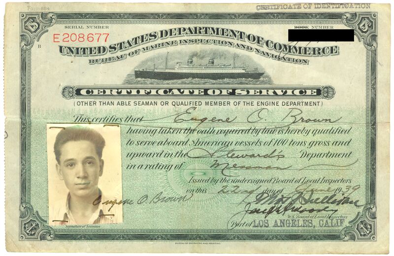 In the case of Brown, here’s what they found: He was born in San Jose in 1922 to parents who’d migrated from Oklahoma in search of work. He had a brother and a sister, both of whom died decades ago. In the summer of 1939, Brown was certified as a cabin steward by the now defunct Bureau of Marine Inspection and Navigation, which enforced laws governing merchant vessels. His photo ID shows a baby-faced 16-year-old with brown eyes and hollow cheeks. In 1941, Brown was hired as a so-called mess boy, or food server, for a Norwegian shipping company that paid him a monthly wage of 79 kroner (about $18 at the time). Rodrigue and Tisserand know this because he detailed his salary and expenses in an accounting book. In January 1942, midway through World War II, he left that job and took a similar one with the U.S. Merchant Marine.