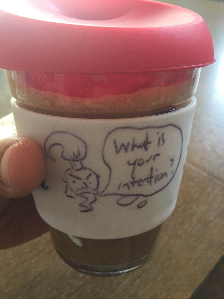 Coffee intentions: my reusable cup reminds me to start the day with the big questions.