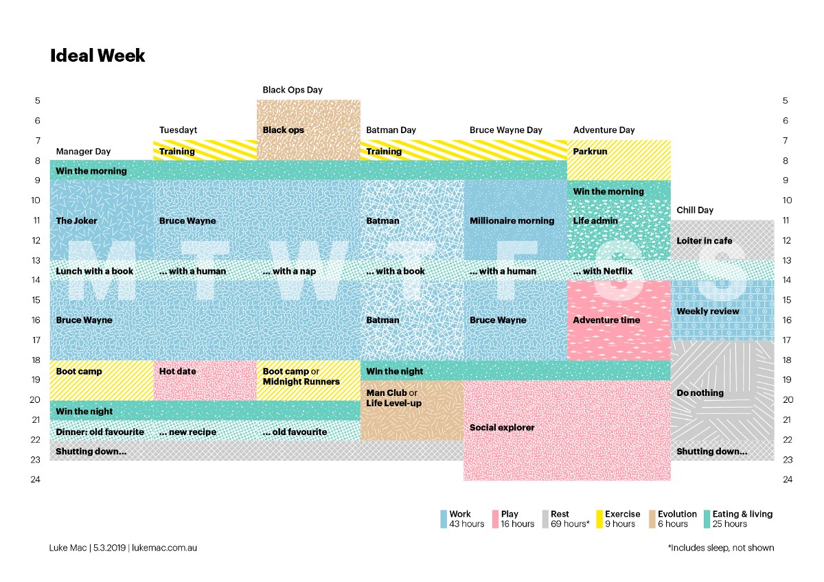 - Thursday is Batman Day: this is a ‘school day’, but rather than focusing on the needs of my clients/employers, today is about working on the deeper purpose of my vocation, the heroic hustles, the passion projects, the redemption of Gotham City. Why Batman? Another concept lovingly stolen from Jessica Hische is the separation of Batman (the mission) and Bruce Wayne (the money) when thinking about work: do both, and be aware of which is which (these are discussed further in the next section).