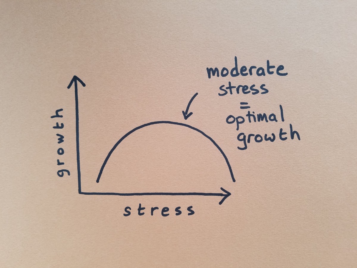 Setting the just-right level of stress is also important. We can model stress and growth as a u-curve (or perhaps as an upside-down u-curve, an n-curve?). Low stress allows for diffuse attention which can lead to distraction and boredom. High-levels of stress lead to feelings of anxiety, a desire to give up and turn towards learned helplessness. Moderate just-right stress focuses the mind, challenges one to build greater flexibility and strength in whatever systems are being stressed.