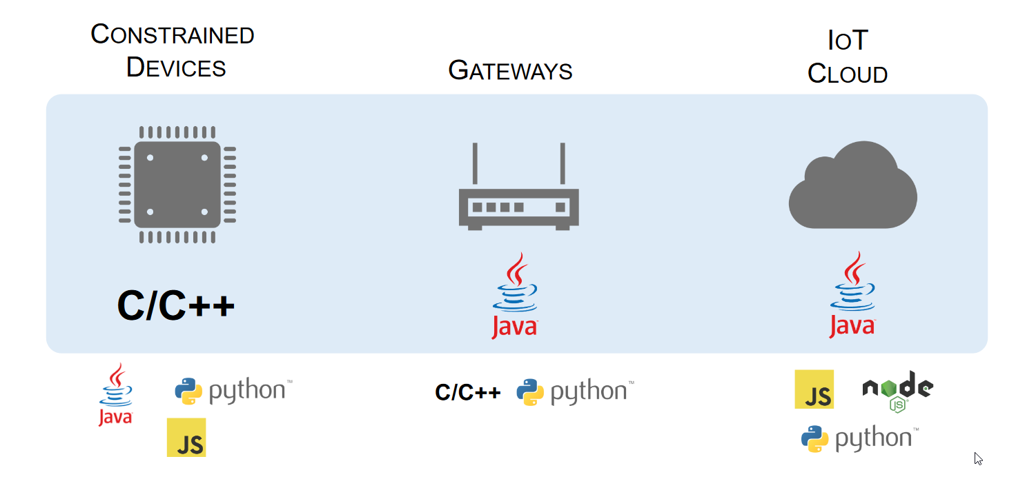 • Gateway development: Devices that are used for gateways basically are minicomputers with relatively good computation power and storage. Just to make it clear, gateway devices are devices that serve as a connection between the sensors of a microcontroller and a service in the cloud. They have a Wi-Fi/cellular connection, they can have a database and many more utilities. For gateway software development most common technologies are Java because of its portability and rich ecosystem, Python because of its simplicity, easy maintenance, rich ecosystem and C++ because of its performance. Let’s name some cool frameworks for a couple of languages: JavaGoJavaScriptPython, etc.