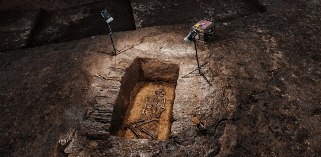 Standing on it now, he peels back a tarp to reveal what’s underneath: a rectangular chamber containing the skeleton of a chieftain, lying on his back with his knees bent. Impressions from the reed mats and wood beams that formed the roof of his tomb are still clear in the dark, hard-packed earth.