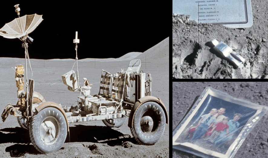 • a small aluminum sculpture, a tribute to the American and Soviet “fallen astronauts” who died in the space race — left by the crew of Apollo 15