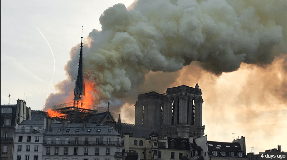 Minutes earlier, at 6:44, Elaine Leavenworth, a tourist from Chicago, had taken a picture of the facade against a clear blue sky. By the time she took a short walk across Pont Saint-Michel, she smelled smoke. She looked back to see the towers engulfed in smoke, and took another shot.