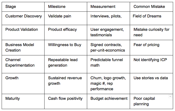 Every life stage has an accompanying set of objectives that, if achieved, allow the startup to advance. The key is to align your milestones to your stage. Work with the end in mind. Below is a simple cheat sheet that shows both the typical milestone and the most common mistakes founders make for each stage.