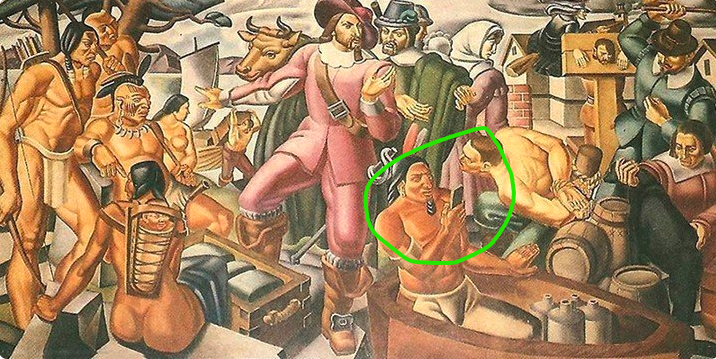 While knives and iron blades were popular trade items during the 1600s, Bruchac explained how an accurate depiction of a blade should have a hole, meant for fastening it to a handle for an axe or tomahawk. The box the man is sitting in, which she suspects is meant to evoke a dugout canoe or shipping crate, “bears no resemblance to any historical wooden container or boat from any nation.” Similarly, the woman with the cradleboard (lower left quadrant) should be clothed, the English garb is wrong (“what’s with the pink suit?”), and there is a witch riding a broom in the far background.