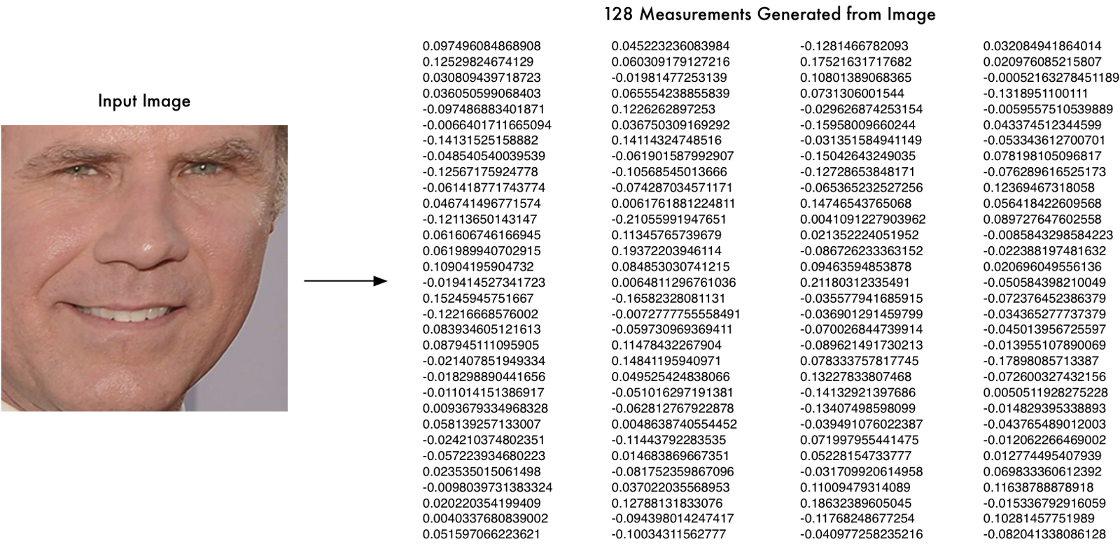 Machine learning people call the 128 measurements of each face an embedding. The idea of reducing complicated raw data like a picture into a list of computer-generated numbers comes up a lot in machine learning (especially in language translation). The exact approach for faces we are using was invented in 2015 by researchers at Google but many similar approaches exist.