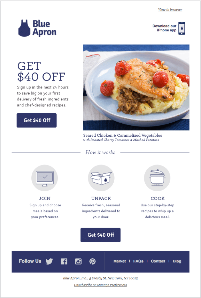 This is great promotional email example from Blue Apron (woah their logo is actually a blue apron).