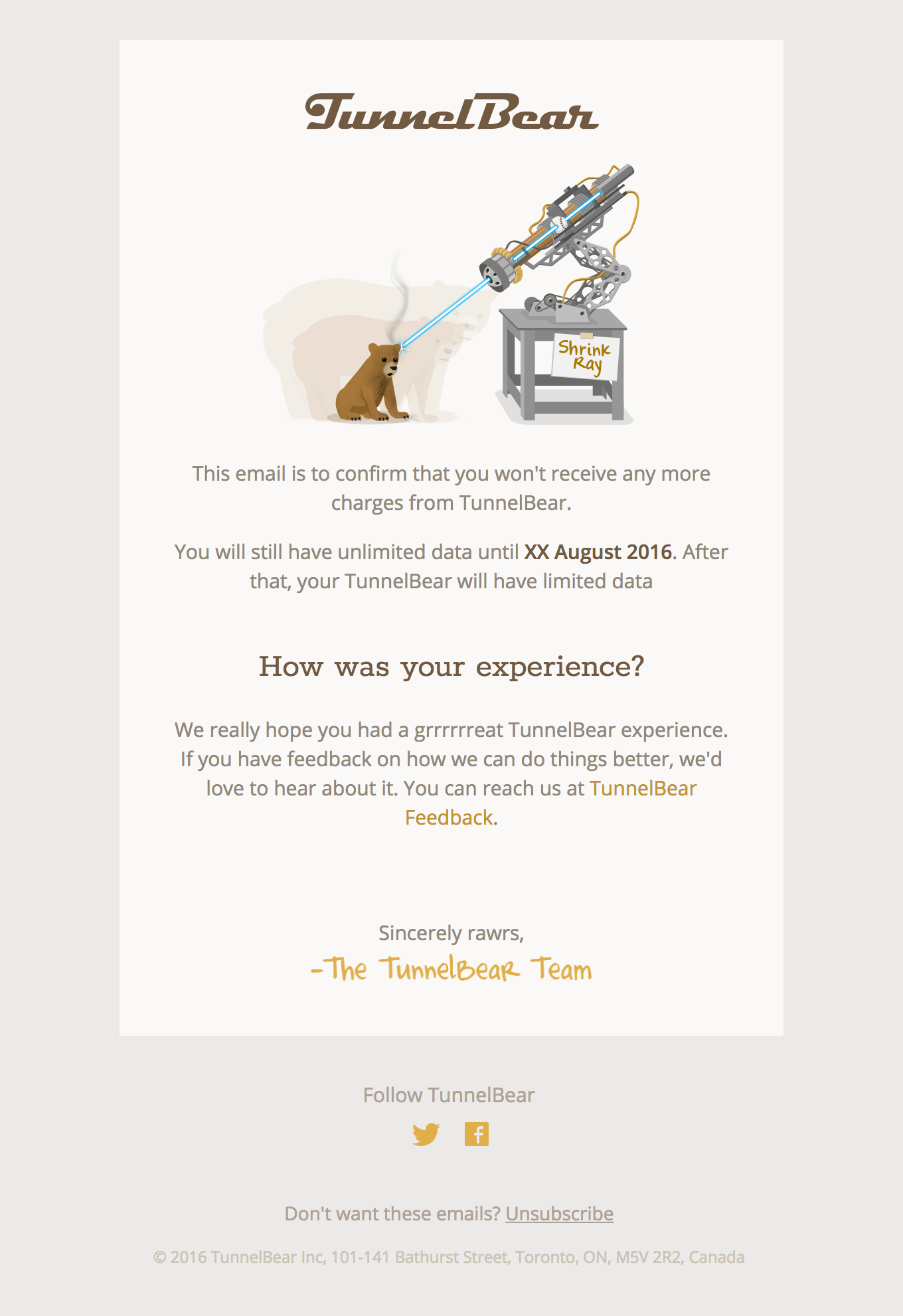 This is an email TunnelBear sends when you cancel your account. Even though you are leaving as a customer, they still are trying to engage with you.