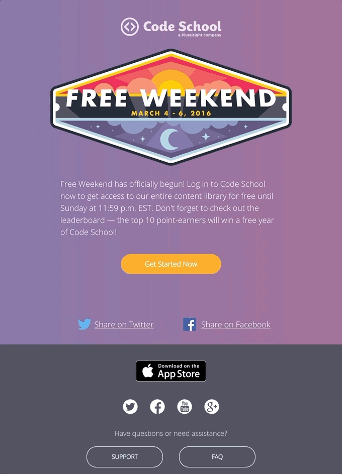 “I loved that the brand image went from day to night and wanted to “simulate” that in some way, tying it in to a weekend of time. I hadn’t seen anyone do the rotating gradients in an email and figured it would blow some minds that it was even possible.” — Dan Denney, Code School