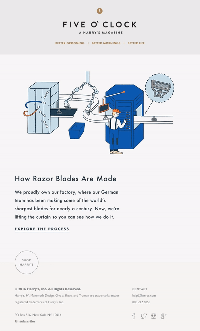 “This email is telling a compelling story. The GIF elevates a factory moment to become playful and captivating at first glance, while the copy leans into the article ending with suspense — suspense that can can end with the click of a button. There’s also something to be said for it’s simplicity. It’s very digestible. Within seconds you’ve absorbed the entire thing.” — Adrien Grey, Harry’s