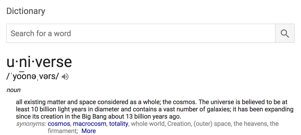Second, we live in a universe. We have no idea if ours is the only universe. Our universe is not the universe — there might be others. So the universe is not “all existing matter and space”. Our universe is the entire area of connected spacetime birthed in the Big Bang. There might be other areas of connected space time in existence, they just aren’t connected to ours, so matter and energy cannot travel between them, leaving us all essentially marooned.