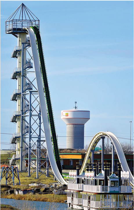 And in Kansas City, even those who cared little for water or who couldn’t afford Schlitterbahn’s $45 admission ($35 for children) would drive by the park just to get a look at Verrückt. At 168 feet 7 inches tall, Verrückt, which means “insane” in German, was taller than Niagara Falls. Three riders inside a rubber raft would plummet down a nearly vertical seventeen-story drop at speeds reaching up to 68 miles per hour. The moment they reached the bottom, they would shoot up a 55-foot-tall incline—the equivalent of a five-story building—before racing down one last steep slope, finally coming to a stop in a long, water-filled runout.