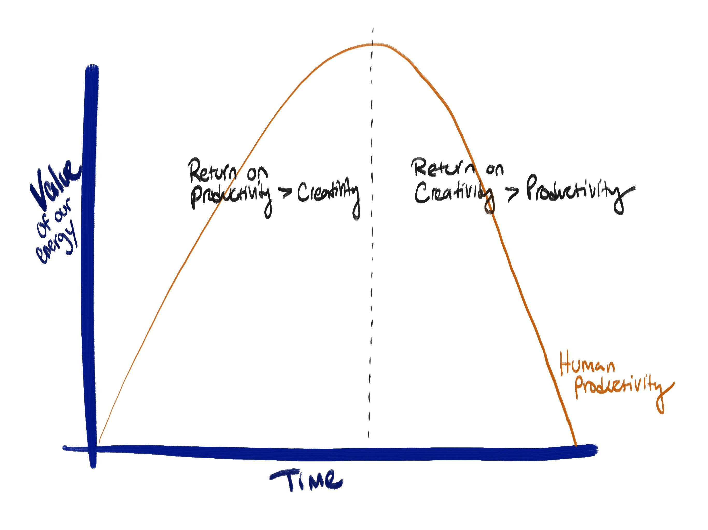 In the Human Productivity Parabola (see graph below), we have now passed the point — call it the “Productivity-Creativity Inversion” — where machines (algorithms, robots, etc.) have become a better investment for future productivity gains than humans. At this point, we as humans are better off spending our energy on creativity than on productivity.