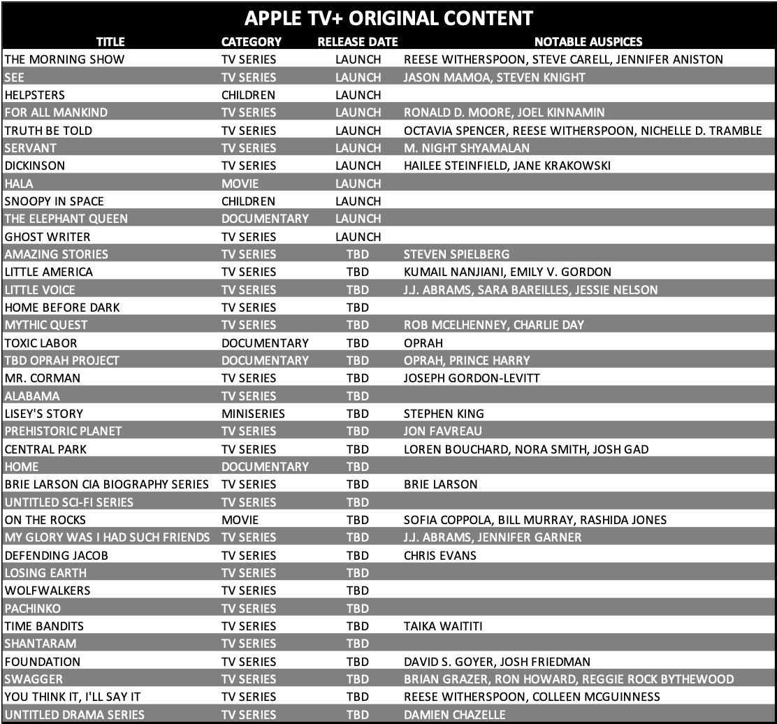 There was some speculation on whether Apple TV Plus would follow a bingeable or weekly-release schedule. It appears that the answer to both is “yes.” According to Apple, some series will premiere with three episodes, followed by a new episode each week, while others will drop every episode at once. It makes sense for Apple to experiment with release schedules in the beginning, and as I’ve written about, perhaps utilize both distribution schedules depending on the specific piece and genre of content.