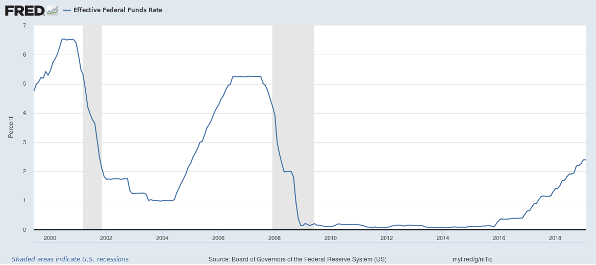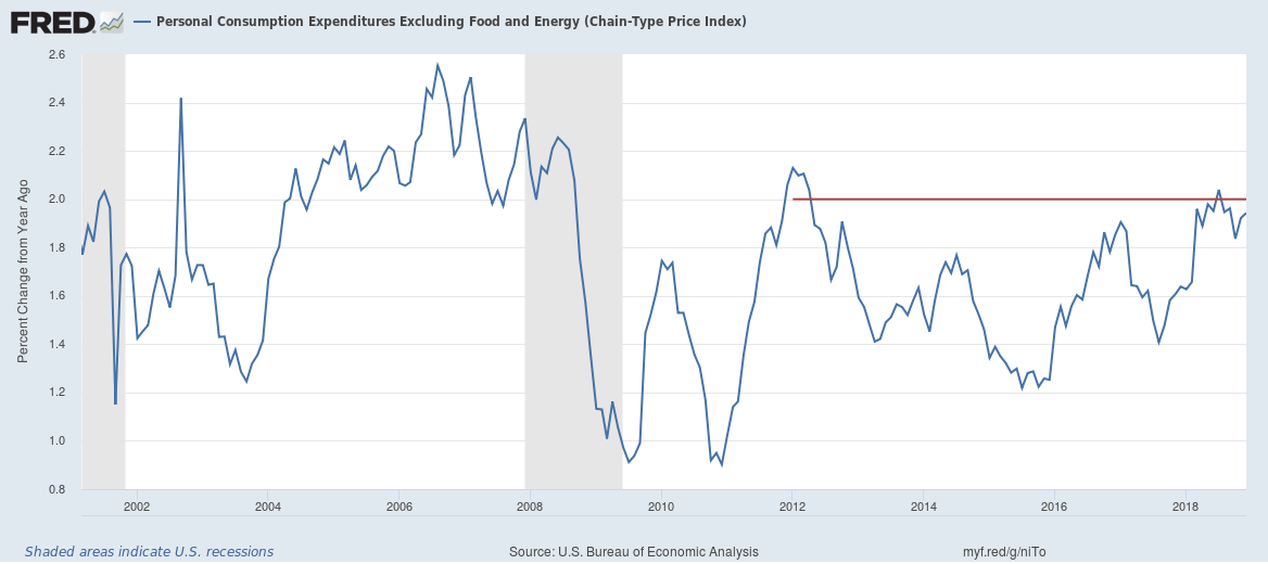 Since the 2012 introduction of an official 2% inflation target, the Fed’s preferred inflation metric (the Core PCE) has remained consistently below it. This is particularly odd, given that interest rate hikes have been steady and less aggressive than in previous recoveries. Interest rates currently sit at about 2.4%, well below their pre-recession levels.
