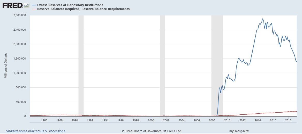 Starting in 2008, the Federal Reserve made the decision to pay interest on excess reserves. The effect has been dramatic: