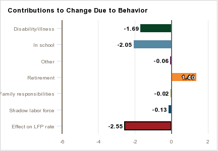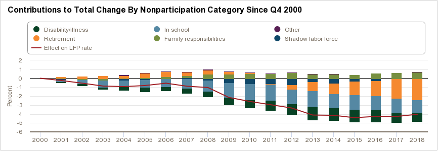 We can see that the 2.55% reduction in labor force participation has been driven by an increase in schooling and disability/illness. Disability/illness is not a category that is typically responsive to shifting labor markets. However, schooling is known to fluctuate with labor market conditions. This share has been relatively stable in recent years though, even as the labor market improved. Most of the movement has come from the retirement and shadow labor force categories. This suggests that the declines in labor force participation can be attributed to more structural reasons.