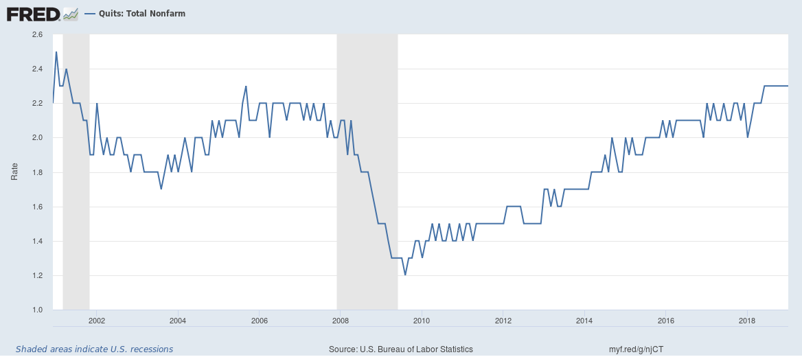 The quit rate has returned to pre-recession levels, indicating workers are confident in quitting their job that they will be able to find another one.