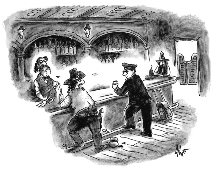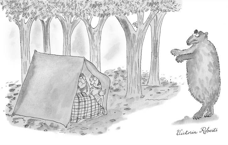 “Which would be more dangerous—a bear, or a man in a bear suit?”Cartoon by Victoria Roberts