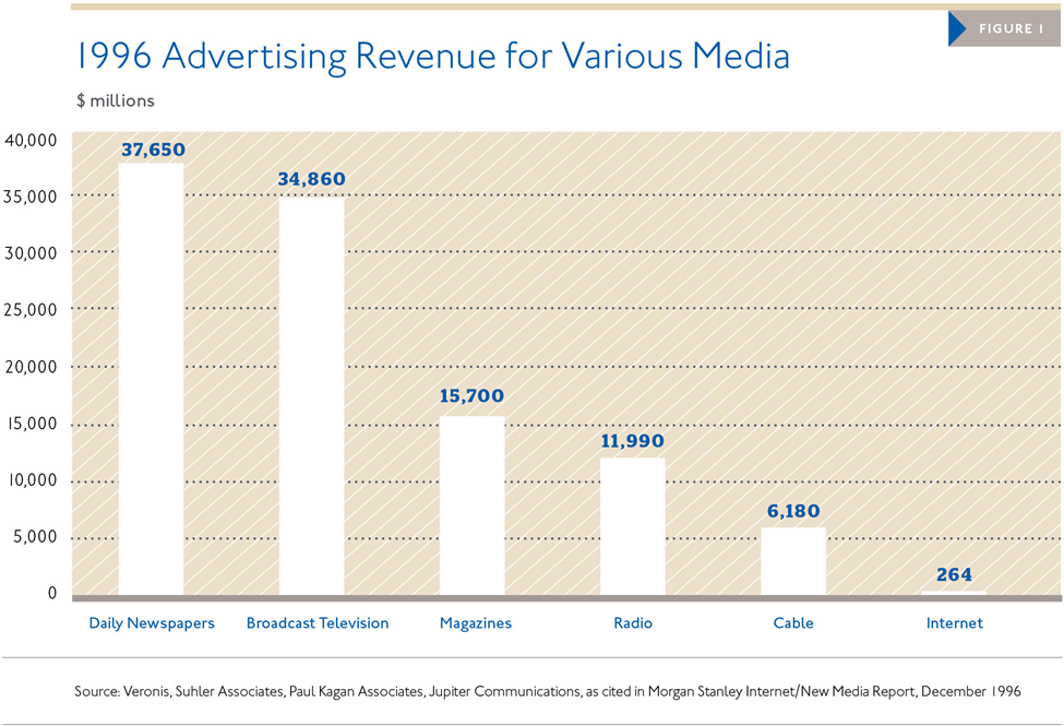 As you worked your way through the budgets and plans for each of the properties not one of your publishers asked for money to experiment with any kind of online business, but now your irritating business development vice president is pushing hard for the company to experiment with, of all things, the internet. Damnit, she always finds a way to get under your skin. We need to move her out to one of the papers, she badly needs operating experience, a dose of the real world would really do her good. She shows you this chart: