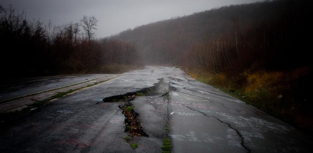 The road is dark, sharp and slippery, winding through naked trees and into the wintry Pennsylvanian mist. Thick layers of clouds are concealing the hills, black rocks and silver birches lingering in the morning’s dim blue haze. The stillness of the early hours hasn’t broken yet. Lonely headlights are striking the highway’s glassy surface when I enter the borough of Centralia.
