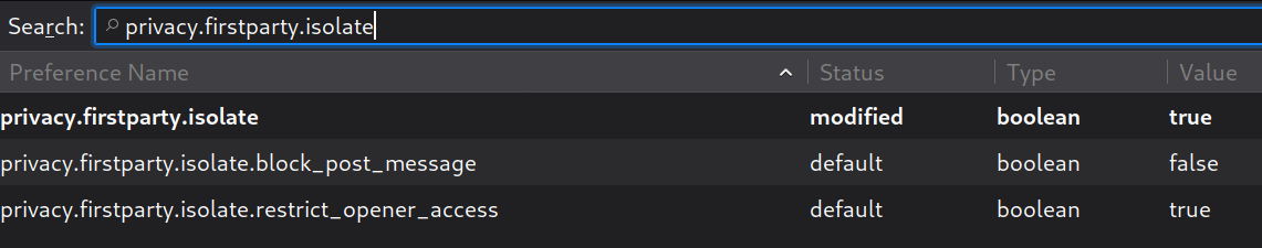 Search for “privacy.firstparty.isolate” and set its value to “ true “.