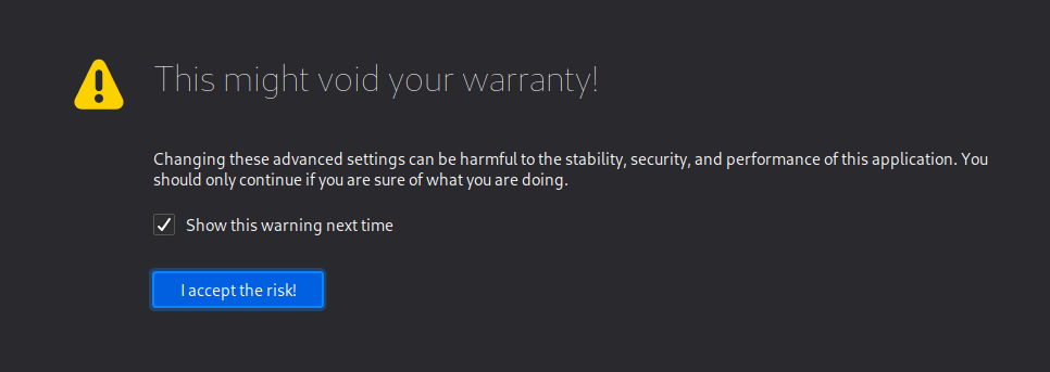 Click on “ I accept the risk!” button on the humorous “ This might void your warranty! “ warning message.