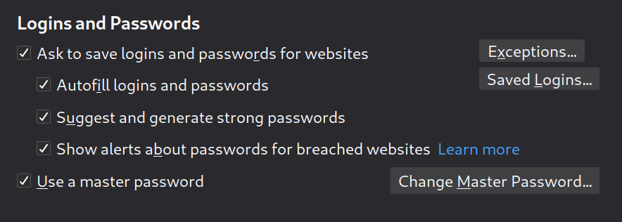 Firefox will not only save all your passwords, but it will also auto-fill them, it will generate strong passwords for you when signing up for new accounts and even alert you in case websites you visit have been breached.