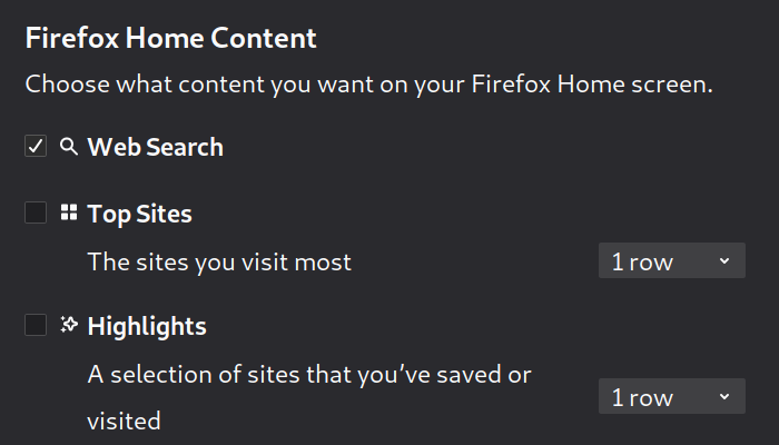 I untick everything in this section with the result being a nice blank, dark home page and new tab page.