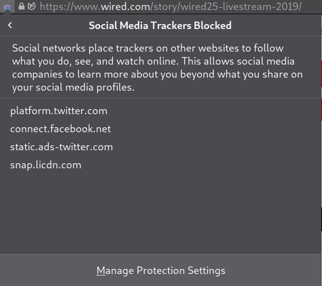 On a typical Wired.com article, Firefox blocks four social media trackers from Facebook, Twitter and Linkedin.