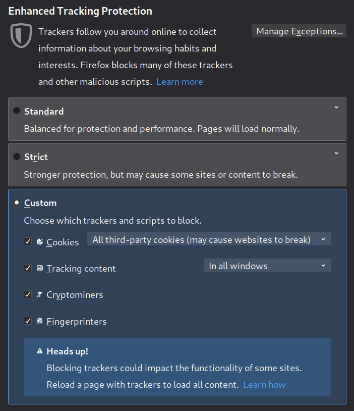 In “ Cookies” block “ All third-party cookies” and in “ Tracking Content” select “ All Windows”. Tick “ Cryptominers” and “ Fingerprinters “ too.
