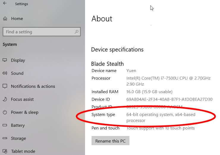 In Windows 10, go to Settings > System > About or type About in the Windows 10 search box. Under the Device specifications heading, you’ll see it at System type: “64-bit operating system, x64-based processor” means you’re covered.