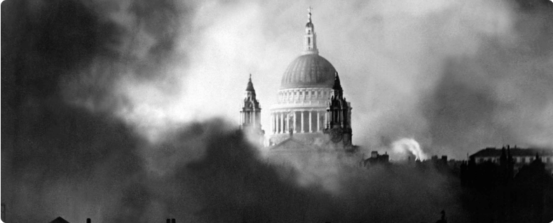 Inside the cathedral that April night, as Butler watched the buildings burn, a single red light hung from the underside of the dome. Water sometimes pooled beneath it, blown in through shattered windows. The high altar lay ruined, destroyed in the raid featured in the Daily Mail’s “unharmed” photograph, a tangle of scaffold supporting the arch above. The little remaining stained glass glowed from the fires outside, picking out a mechanism of pulleys and gantries, designed to lower the injured from the upper floors. Butler liked the cathedral most this way, icy blue and painterly in the moonlight, the white stone whiter somehow, the shadows rich and dark, with just a hint of red. Dim flashlights could be seen scurrying around the Whispering Gallery, and down the mile or so of cathedral corridors. A dozen men, mostly middle-aged or elderly, carried sandbags and water pumps, hurrying to the incendiaries that rattled on the lead roofs, like coals falling from a scuttle. Water ran down the staircases hidden in the hollow walls, as women carried up cups of tea.