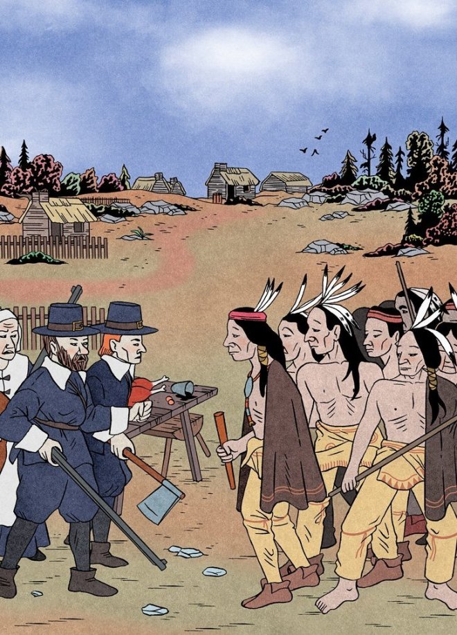 Wampanoag people consolidated their survivors and their lands, and reëstablished internal self-governance. But, to the west, the Narragansetts—traditional rivals largely untouched by the epidemic—now outnumbered the Wampanoags, and that led to the strengthening of Ousamequin’s alliances with the surviving Massachusett and another nearby group, the Nipmucks. As the paramount sachem, he also had to contend with challenges to his leadership from a number of other Wampanoag sachems. And so, after much debate, he decided to tolerate the rather pathetic Pilgrims—who had seen half their number die in their first winter—and establish an alliance with them. That history, understood through Wampanoag characters and motives, explains the “rejoicing” that Americans later remembered as a pumpkin-spiced tale of Thanksgiving conciliation.