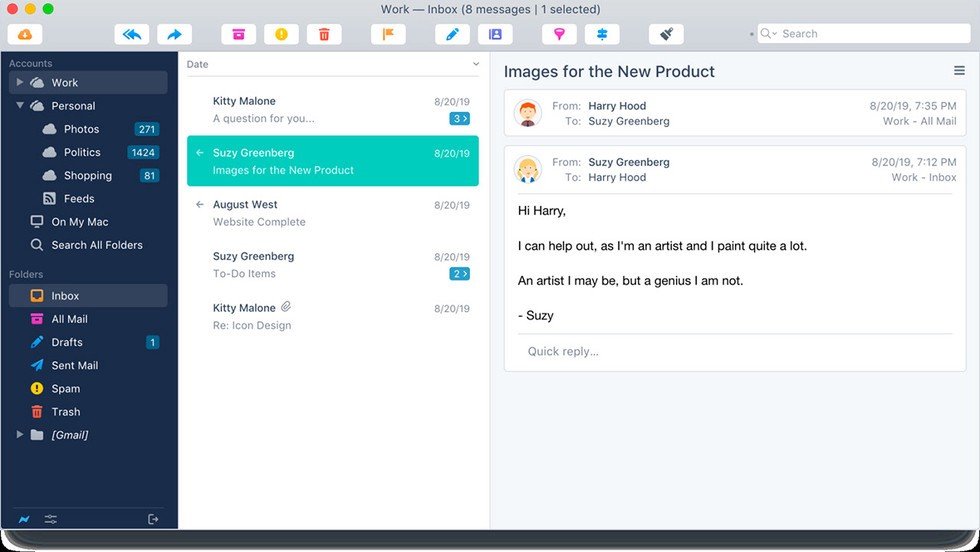 Front is an email app for teams. It’s designed for groups of people who manage an inbox together, such as a small business where everyone answers emails sent to a generic company address. Front not only lets a group of people access the same inbox, but also delegate tasks, such as assigning the job of replying to an email to a particular person. Prices start at $12 per person per month.