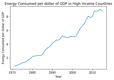 The ultimate measure of economic efficiency is wealth generated per unit of energy consumed, so if MacAfee is correct, we would expect to see a steady decrease in energy consumed per dollar of GDP. However, the results of a quick check using World Bank data doesn’t support this argument; in the plot below, which shows energy consumed per dollar of GDP from high-income countries between 1971 and 2015, it appears the world’s wealthiest economies are consuming a steadily increasing amount of energy.