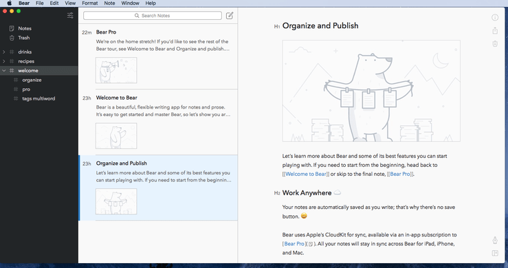 Bear allows you to link notes, which means simply that you can put a hyperlink into your text and direct it to go to another note in the app. There are no restrictions on storage or uploads because everything is saved locally. Whether that’s a boon or a bust depends on how many notes you create, what’s in them, and the space on your devices. In the mobile app, there are no options for selective syncing, though representatives say it’s a feature they are aware is in demand. Right now, however, the syncing setup is all or nothing.