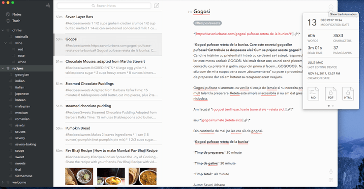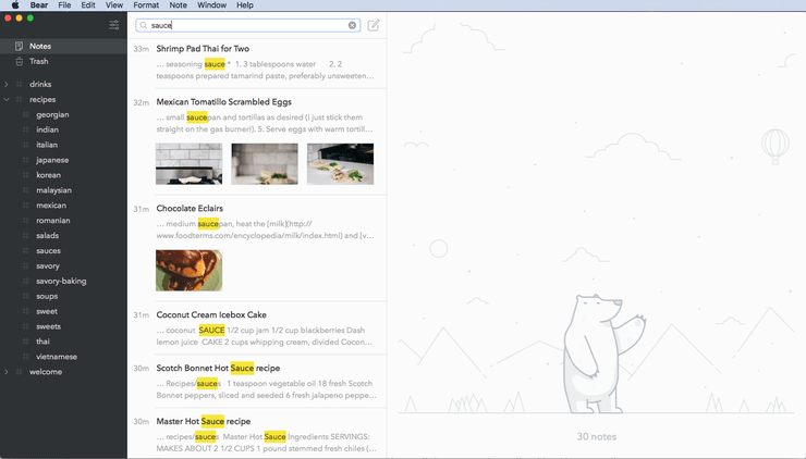 Bear can import notes from other services, including Evernote, making it easy to jump ship and switch apps. To test Bear’s importing prowess, I exported from Evernote a Stack of Notebooks containing 155 notes all pertaining to food and drink. They imported quickly and easily into the Bear Mac app, complete with their images, links, and text styling correctly translated to Markdown. Any tags I had applied in Evernote did not transfer to Bear, however, and a table didn’t make it either. All the contents of the table came across, but the formatting was lost.